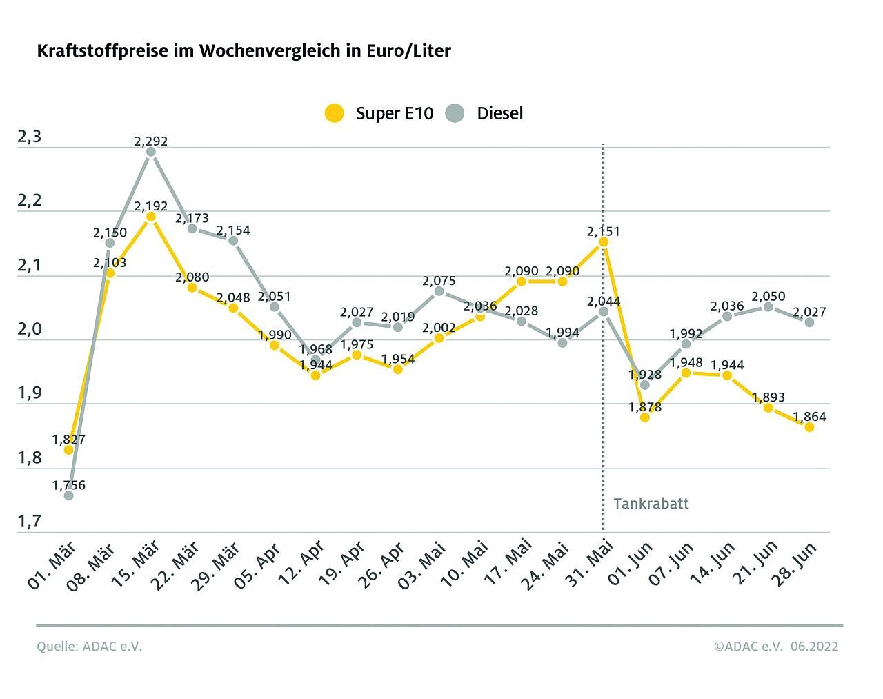 Die Kraftstoffpreise in Deutschland sind im Vergleich zur vergangenen Woche gesunken. Wie die aktuelle ADAC Auswertung der Kraftstoffpreise zeigt, kostet ein Liter Super E10 derzeit im bundesweiten Mittel 1,864 Euro, das sind 2,9 Cent weniger als vor Wochenfrist. Der Preis für Diesel ist um 2,3 Cent niedriger und liegt aktuell bei 2,027 Euro...