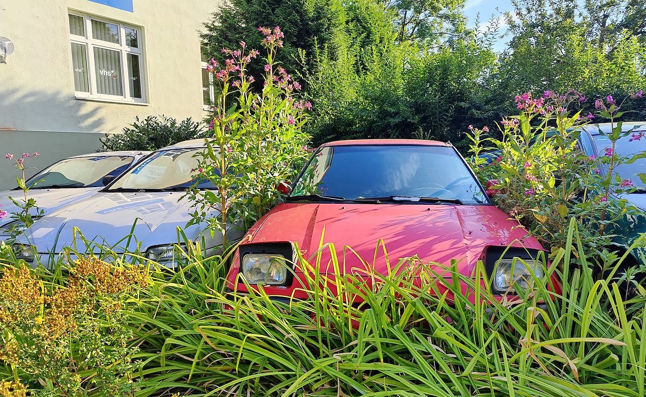 der rote scheint ein Volvo 480 zu sein - bis 1995 gebaut, daneben steht ein Mazda 323F in einer Version, die 1998 eingestellt wurde...alles antiquierte Schüsseln - würde darauf wetten, das die Autos abgemeldet sind. Auf privatem Grund dürfen abgemeldete Autos stehen... und das so lange es der Eigentümer will.