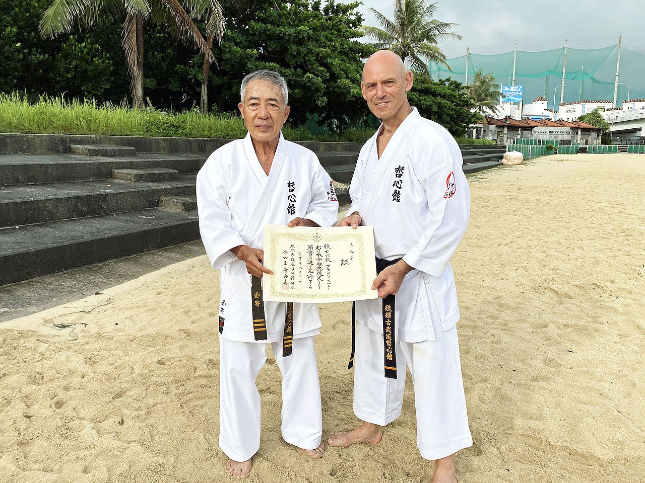 Am Morgen des zweiten Tages begann das erste Training bereits um 7.30 Uhr am Strand. Und da Ausschlafen im Urlaub und Jetlag ja Legenden sein sollen (Zwinker-Smily) führte Meister Tamayose am Ende des Trainings auch gleich die Graduierungsprüfungen durch, damit wir den Kopf für die Weltmeisterschaft frei hatten. Da auch die Prüfung bei schwülen 32 Grad im Sand am Strand stattfand, statt auf glattem Sporthallenboden, war diese Aufgabe nicht ganz einfach zu lösen. Schließlich konnten Frank Pelny und Sebastian Edelmann aus Deutschland und Dan Antonsen aus Kanada erschöpft aber glücklich den 6. Dan im Ryûkyû Kobudô bestehen und erhielten dazu jeweils den Titel Renshi verliehen. Dies war das erste Mal im Tesshinkan-Verband, dass solch hohe Meistergrade an Ausländer vergeben wurden. Ein guter Start und eine außergewöhnliche Ehrung!