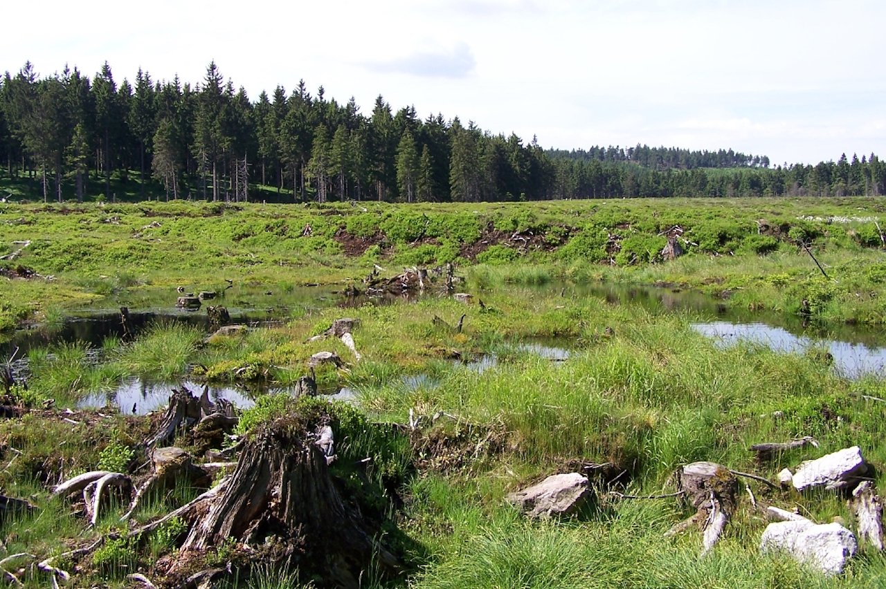 Auf bestockungsfreien und damit weitgehend unbeschatteten Hochmooren können an Hitzetagen Höchsttemperaturen bis 60° C auftreten. Dabei sinkt nicht nur die Hochwasserschutzwirkung des Moores, es wird dabei auch klimaschädliches CO2 freigesetzt. Und die moortypische Artenausstattung gerät durcheinander.