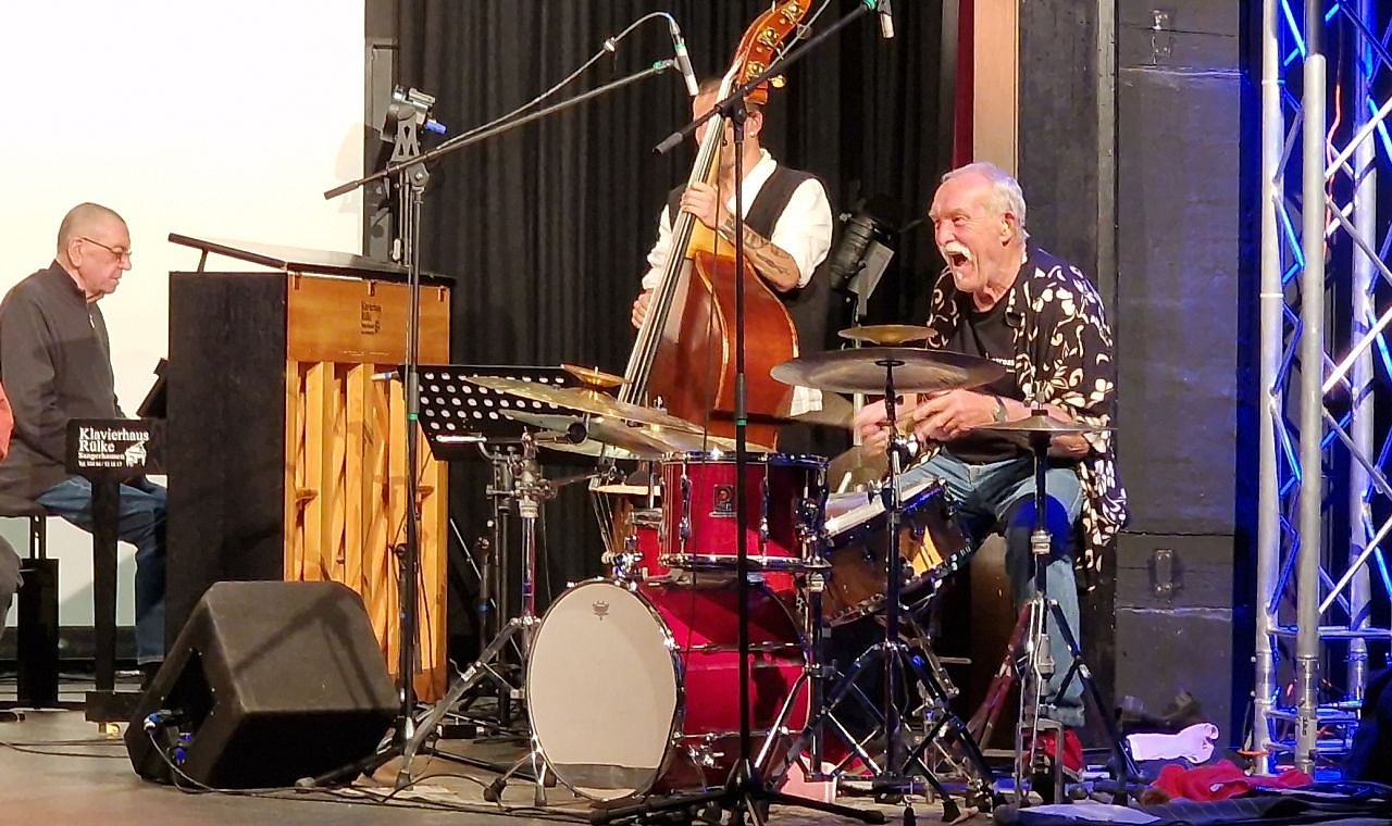 Auf der Bühne des Jugendclubhauses standen (und saßen) an diesem Samstagabend 13 Musikerinnen und Musiker. Am Rand "arbeitete" der 79 Jahre junge Schlagzeuger Günter "Baby" Sommer. Mal traktierte er Tom-Tom, Becken und Trommeln, mal streichelte er alles, was an "Handwerkszeug" um ihn drumherum stand. Quasi so nebenbei "dirigierte" er die Mannschaft, die für kraftvolle und zugleich sensible Töne der freien Jazzmusik stand. Es war eine Mischung aus eingängigen Themen, die quasi den Rahmen für die Improvisationen hergeben mussten.