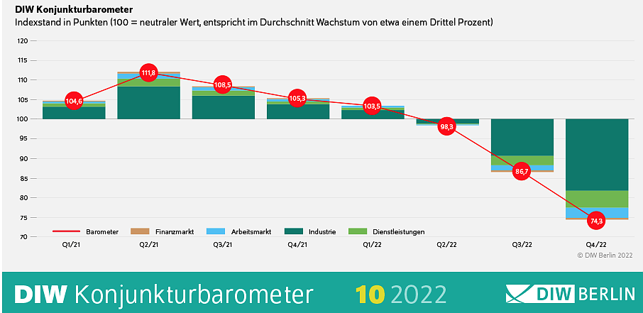 Das Konjunkturbarometer des Deutschen Instituts für Wirtschaftsforschung (DIW Berlin) ist im Oktober noch einmal deutlich gesunken. Es liegt nun bei 74,3 Punkten, gut fünf Punkte niedriger als im Vormonat...