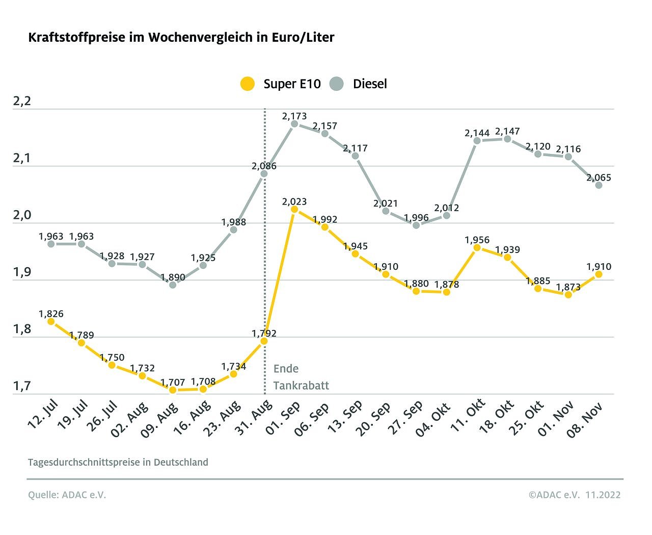 Verteuert hat sich hingegen Benzin: Ein Liter Super E10 kostet 1,910 Euro – ein Anstieg von 3,7 Cent gegenüber der Vorwoche, trotz des im Wochenvergleich kaum veränderten Ölpreises.