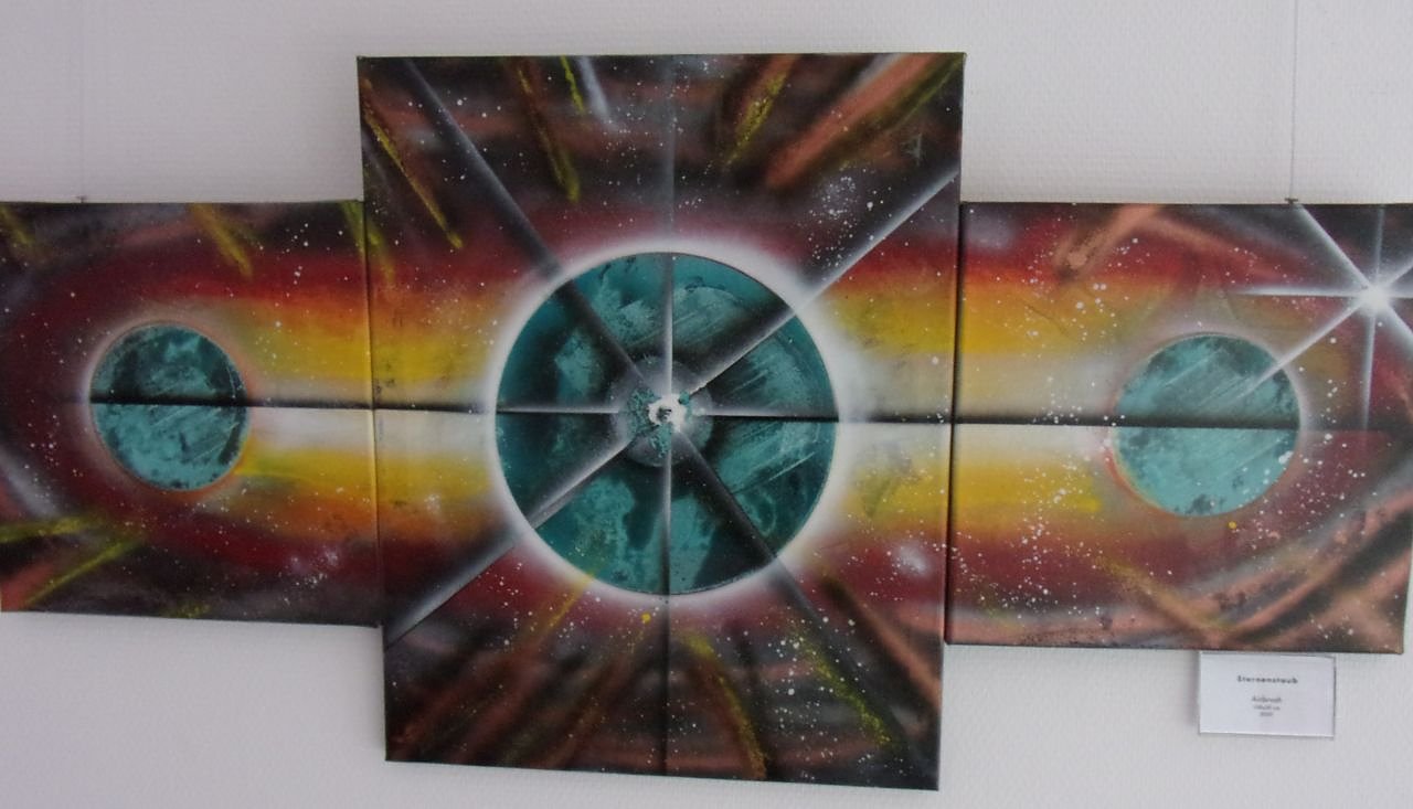 Alsbald folgten Kurse in der Jugendkunstschule in Nordhausen. Zudem bildete sich Pfrogner als Autodidakt stetig weiter. Inzwischen sind unter seinen Händen, ausgestattet mit Sprühdose und Spachtel, bereits 100 Bilder entstanden, wie Simone Nickel in ihrer Einführung zu berichten wusste. Seine Werkstatt hat er sich in Wollersleben eingerichtet und lebt sich dort künstlerisch aus.