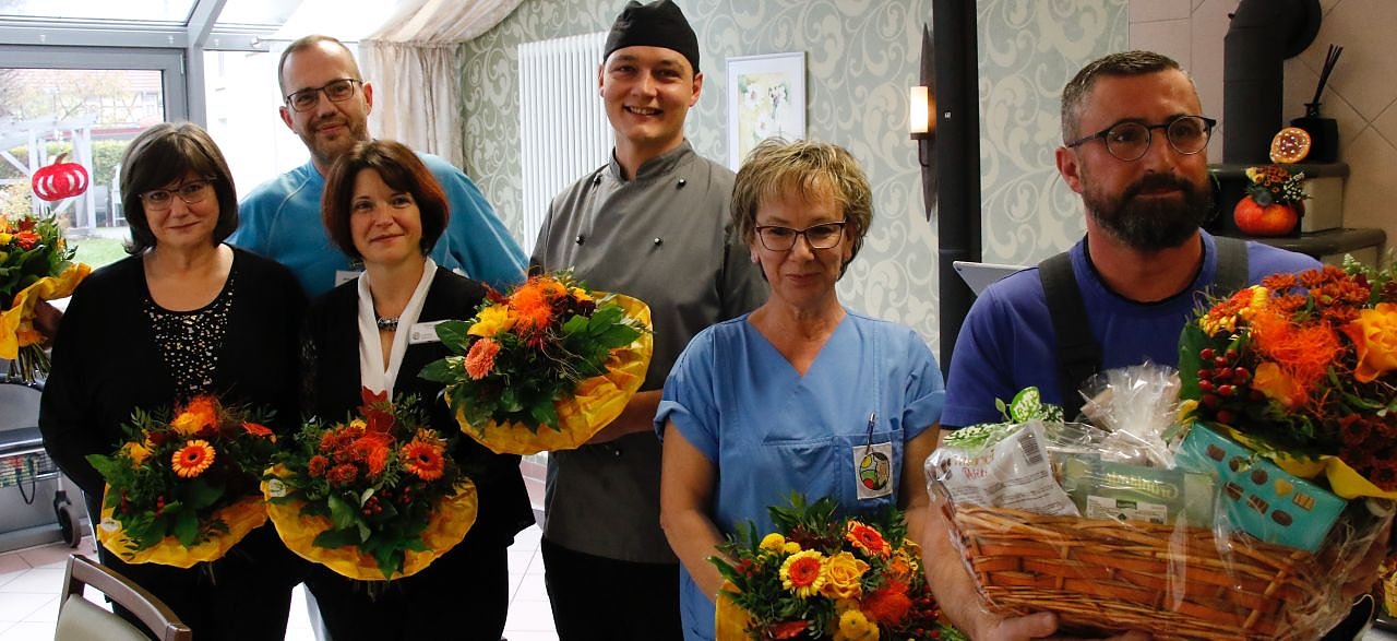 Gleichzeitig waren Mitarbeiter, Freunde, Unterstützer und auch Interessierte zur Jubiläumsfeier eingeladen. Nach der Begrüßung durch den Geschäftsführer des Seniorenwerks, Christian Döring und Einrichtungsleiterin Nadin Hertwig und vielen Danksagungen wollte man sieben Mitarbeiter besonders ehren, denn sie konnten in diesen Tagen auch ihr 10 und 15jähriges Dienstjubiläum feiern. "Sie alle kümmern sich gemeinsam mit viel Herzblut um die Belange der Bewohner. Dazu zählen Pflegekräfte, Betreuungskräfte, Ergotherapeuten, Hausmeister und Mitarbeiter des Wirtschaftsdienstes. Mit großem Engagement und Hand in Hand gestalten sie täglich den uns anvertrauten Menschen einen würdevollen Lebensabend. Dafür danke ich allen herzlich., so Nadin Hertwig, die stolz dabei auf ihr starkes Team blickt: über 100 Mitarbeiter.