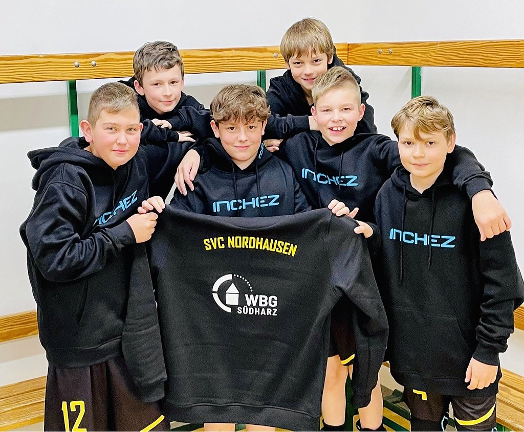 Für den SVC spielten: Noah, Jeremy, Leo, Philipp und Carl. Zur Belohnung gab es vom SVC und der WBG Südharz neu coole Hoodies. Vielen Dank der WBG Südharz für die Unterstützung. (Foto: Dominik Rieger)