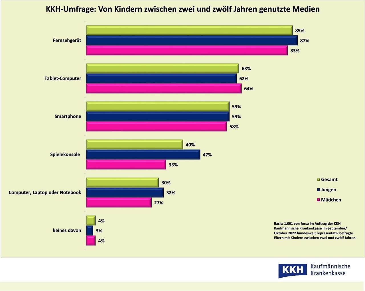 Die Umfrage wurde unter 1.001 Eltern mit Kindern zwischen zwei und zwölf Jahren im Auftrag der KKH Kaufmännische Krankenkasse durchgeführt. Damit verweist das Fernsehgerät als bevorzugt genutztes Medium (85 Prozent) Tablet und Smartphone klar auf die Ränge zwei und drei (63 bzw. 59 Prozent).