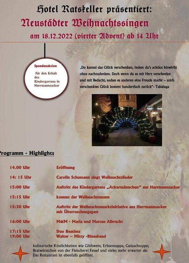 Endlich ist es wieder soweit. Die Mannschaft des Neustädter Ratskellers und viele Vereine der Region haben sich schon lange auf das diesjährige Weihnachtssingen zwischen Kirche und Ratskeller gefreut...