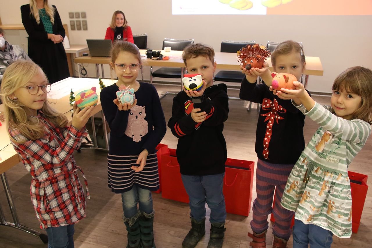 Das waren aber noch nicht alle Gewinner, auch die Plätze 4 bis 6 wurden prämiert. Isabella sicherte der evangelischen Grundschule mit einem Schwein à la nature in Gesetzen Farben den vierten Rang. Richard aus der Montessori-Schule versuchte sich ebenfalls an einem Regenbogenmotiv und wurde mit Platz 5. belohnt. Schließlich Flora, die ein aufwendig-stacheliges Igel-Exemplar anfertigte und damit auf Platz 6 kam.