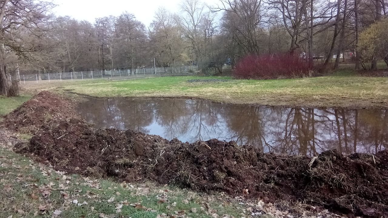 Aktivitäten im Stadtpark. Was sich einst ein kluger Kopf ausdachte, soll nun endgültig und dauerhaft Bestand haben: Ein Lebensraum für Frösche, Kröten, Libellen. Im Hintergrund rechts ist der aufgeschichtete Steinhaufen zu sehen, auf dem sich die Amphibien später einmal aufwärmen können. (Foto: Rosaline Frank)