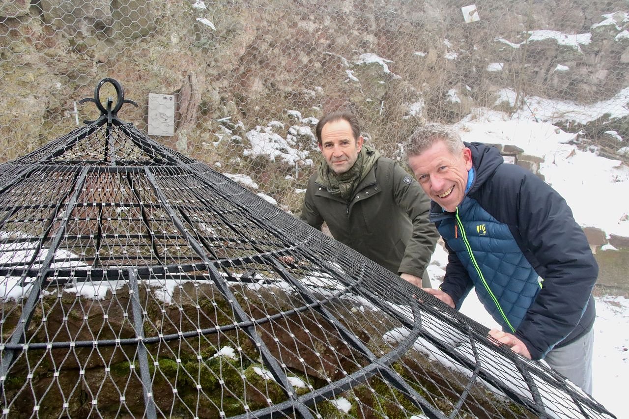 Auch bei dem frostigen Besuch heute ging es um Handfestes: die Bergwacht hat für den alten Burgbrunnen eine neue Überdachung angefertigt. Nötig geworden war die, weil sich manch Besucher nicht damit zufrieden gibt, nur ein paar Kiesel in den rund 28 Meter tiefen Schacht plumpsen zu lassen. Es gibt leider Leute, die haben hier regelrechte Brocken reingeschmissen, berichtet Ströbele, das hat uns die Beleuchtung gekostet, die Abdeckung und die Scheinwerfer wurden schlicht zerschmettert. Deswegen hat man nun das Grundgerüst der Abdeckung saniert, mit frischem Witterungsschutz versehen und einem engmaschigerem Draht überzogen. Außerdem gab’s zur optischen Zierde ein Krönchen oben drauf.