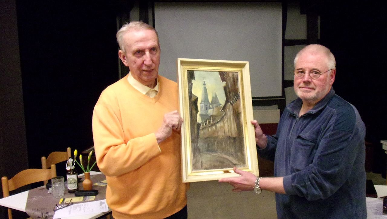 Den Höhepunkt des Vereinsabends bildete die symbolische Überreichung einer besonderen Kostbarkeit: Es handelt sich hierbei um das Lebenswerk des enthusiastischen Freizeitmalers Walther Reinboth (1899-1991), der Szenen der Stadt und die Südharzer Landschaft in Aquarellen und Kohlezeichnungen festhielt. Michael Reinboth aus Walkenried gab in seinem Vortrag einen Einblick in das Leben und Werk seines Großvaters, der Nordhausen nach den Luftangriffen 1945 verlassen musste. Obwohl er sehr an der Stadt hing, wollte er sie nach ihrer Zerstörung nie mehr betreten; doch nach dem Fall der Mauer – in seinem 90. Lebensjahr – sah er sie noch einmal.