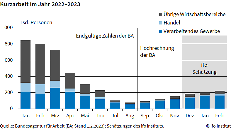 Die Zahl der Kurzarbeiter ist im Februar um knapp 9 Prozent auf 220.000 Menschen gestiegen. Im Januar waren es 203.000. Das ist die höchste Zahl seit Juni vergangenen Jahres. Das geht aus Schätzungen des ifo Instituts auf Grundlage der ifo Konjunkturumfragen und Zahlen der Bundesagentur für Arbeit hervor...