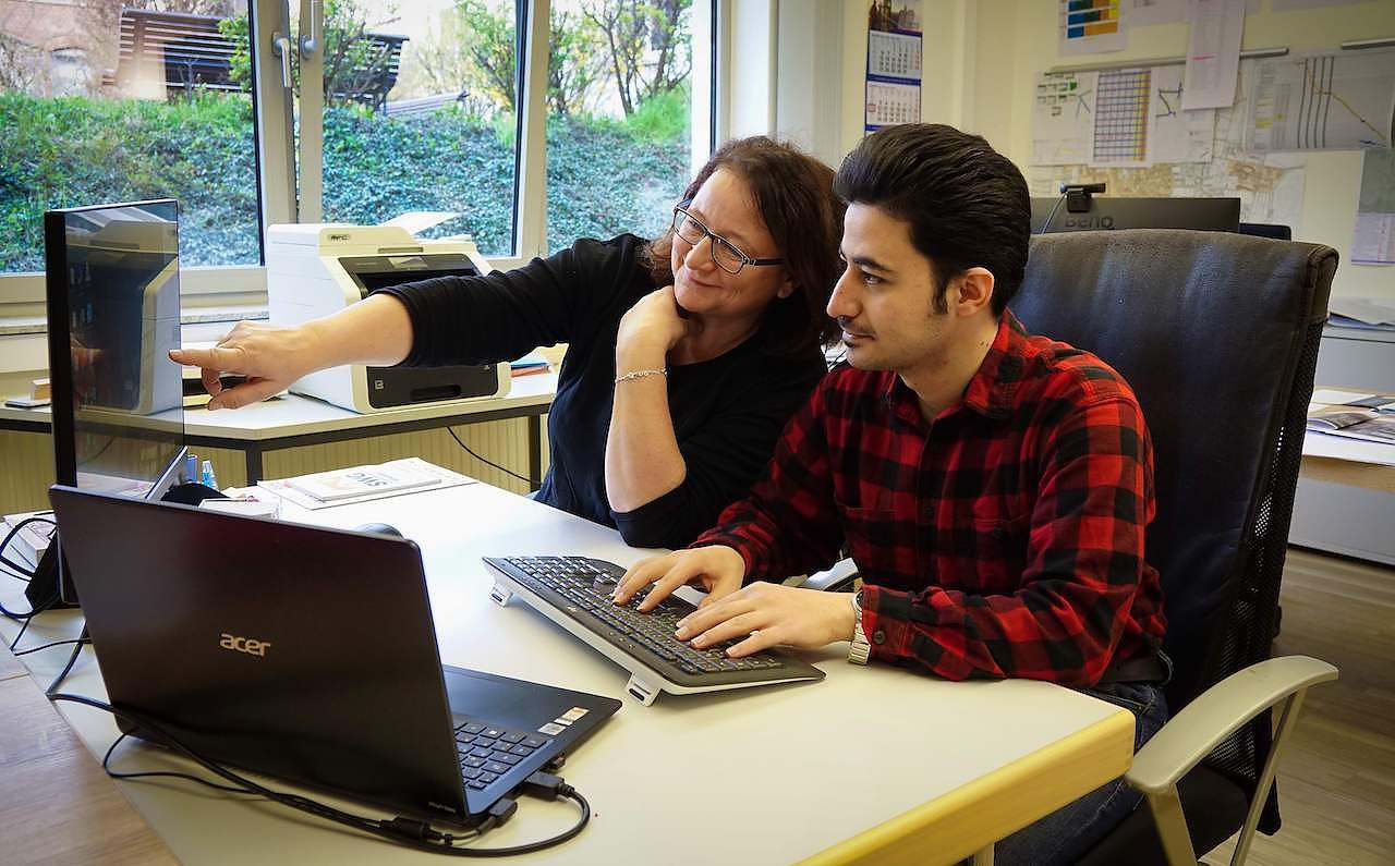 Foto: SWG-Mitarbeiterin Andrea Rahmig im Gespräch mit dem Werkstudenten Koorosh Parvaz.