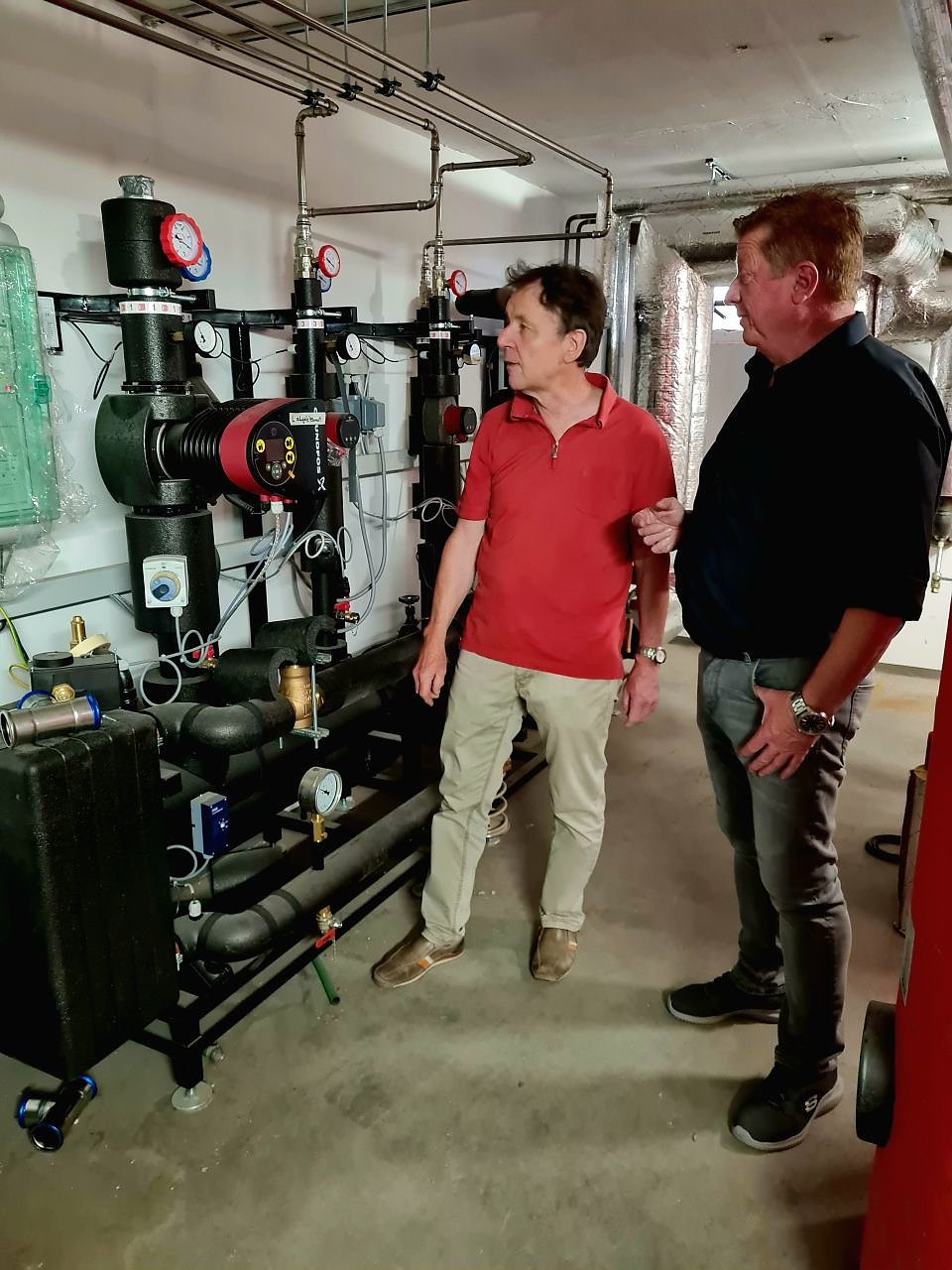 Planer Elko Vopel und SWG-Projektleiter Steffen Peter (r.) besprechen vor der neuen Fernwärmeübergabestation im Keller des Seniorenwohnblocks letzte Details (Foto: SWG/Susanne Schedwill)