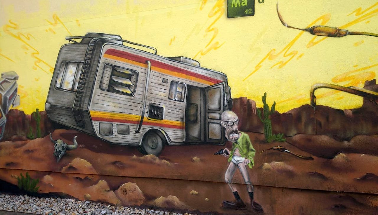 Das entbehrt nicht einer gehörigen Portion Ironie: Auf dem täglichen Schulweg hunderter Kinder wird an einer Wand per meterlanger Graffiti einer amerikanischen TV-Serie gehuldigt, in deren Mittelpunkt ein ehemaliger Chemie-Lehrer steht. Doch damit nicht genug…
