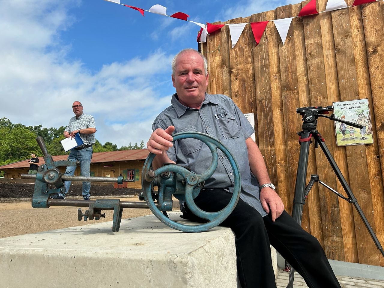 Im Namen der Echter Nordhäuser Traditionsbrennerei überbrachten deren Leiter Thomas Müller und der Sammler Hans-Jürgen Arndt zur Eröffnung des Deutschen Bratwurstmuseums eine historische Maschine zum Verschließen von Wurstdosen und einen Traditionskorn im Steinkrug.