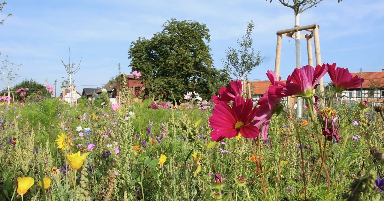 Geklappt hat es dann erst im zweiten Anlauf, mit Landesförderung und einem Zuschuss der Kreissparkasse konnte das Gelände in diesem Jahr schließlich vorbereitet und zwei Dutzend Bäume gepflanzt werden. Die Kreishandwerkerschaft unterstützte das Projekt mit einer einladenden Sitzbank am Rande der Wiese und einem Insektenhotel, dessen Innenleben von Kinderhand ausgestattet wurde. Das Ergebnis kann sich wirklich sehen lassen, 2000 Quadratmeter schönste Blütenpracht.Von Natur aus würde eine solche Wiese ähnlich aber doch nicht ganz so prächtig wachsen. "Mutter Natur würde das schon hinbekommen aber ein bisschen Einfluss nehmen wir dann doch, etwas Hand muss man anlegen", erzählt Stadtförster Axel Axt am Rande. Brennessel und Diestel seien zwar auch nicht verkehrt, würden hier aber nicht ins Bild passen. Der Pflegeaufwand soll sich derweil in Grenzen halten, ein vielleicht zwei mal im Jahr werde man mähen, die nächste Saat soll die Wiese schon weitestgehend alleine besorgen. Die Pflanzmischung ist so angelegt, dass der Anger von Frühling bis Spätsommer etwas für das Auge bieten wird. Zwischen 75.000-95.000 Samenkörnen wurden auf der Fläche eingesät, erklärt Stefanie Wenzel vom Pflanzenhandel August, darunter Mädchenauge, Malve und Sonnenblume. In der Mischung finden sich außerdem 35 verschiedene einjährige und zweijährige Stauden.