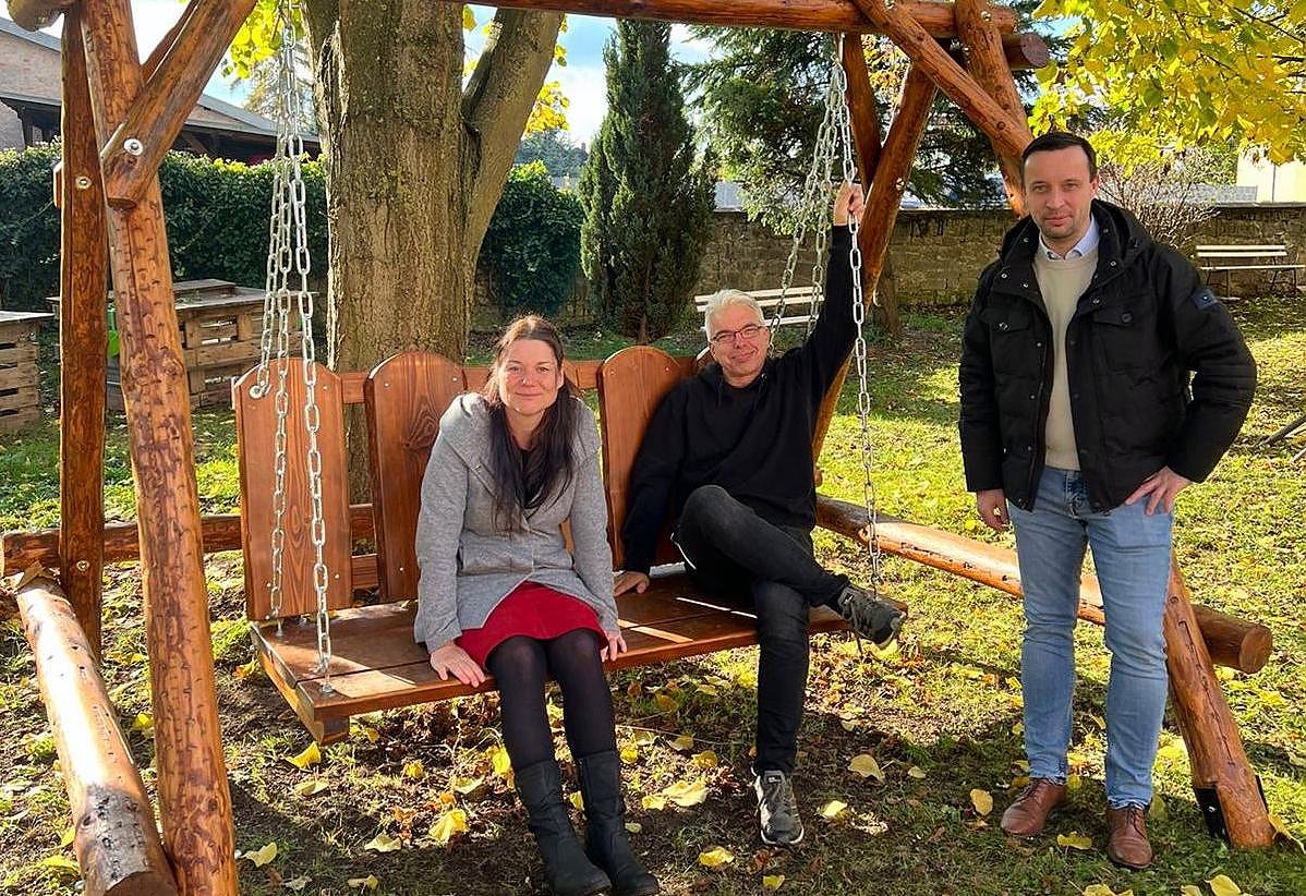 Schon am darauffolgenden Tag wurde das Thema mit Leben gefüllt. Die Augen der Urbacher Kirchenvorstandsvorsitzenden Kirstin Volkmann strahlten, als sie stellvertretend für die Kirchengemeinde eine Riesen-Hollywoodschaukel, gefertigt von FIB in Nordhausen, in Empfang nehmen durfte. René Fullmann übernahm die Kosten und freute sich, einen großen Beitrag für den St.-Johannis-Schöpfungs-Kirchgarten leisten zu können. Fa. Uwe Dorl übernahm den Transport nach Urbach.