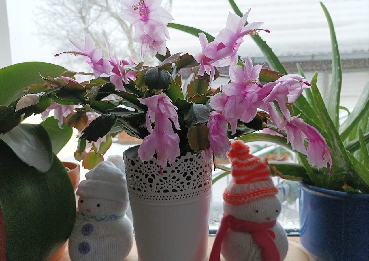 Zu seinem Foto schrieb er uns: Nun entfaltet auch der Weihnachtskaktus in unserem Hausflur seine schöne Blütenpracht, dieser hier in rosa Farben, umrahmt von selbstgebastelten Schneemännern (weiße Socken mit Reiskörnern gefüllt) mit Gesicht, Schal