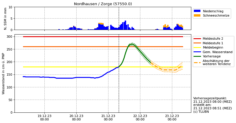 Für die Helme wird kein Erreichen des Meldebeginns prognostiziert. Mit dem Meldebeginn einher gehen die ständige Beobachtung der meteorologischen Lage und der Hochwassersituation im Flussgebiet, einschließlich der Entwicklungstendenzen, die Beobachtung der Entwicklungen in den Zuflussgebieten sowie die Überprüfung der Funktionsfähigkeit der Informations- und Meldewege und der technischen Einsatzbereitschaft.