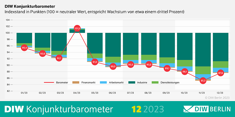 Das Konjunkturbarometer des Deutschen Instituts für Wirtschaftsforschung (DIW Berlin) ist im Dezember im Vergleich zum Vormonat um rund zwei Punkte gestiegen und liegt nun bei 87,6 Punkten. Damit bleibt die 100-Punkte-Marke, die ein durchschnittliches Wachstum der deutschen Wirtschaft anzeigt, weiterhin deutlich entfernt...