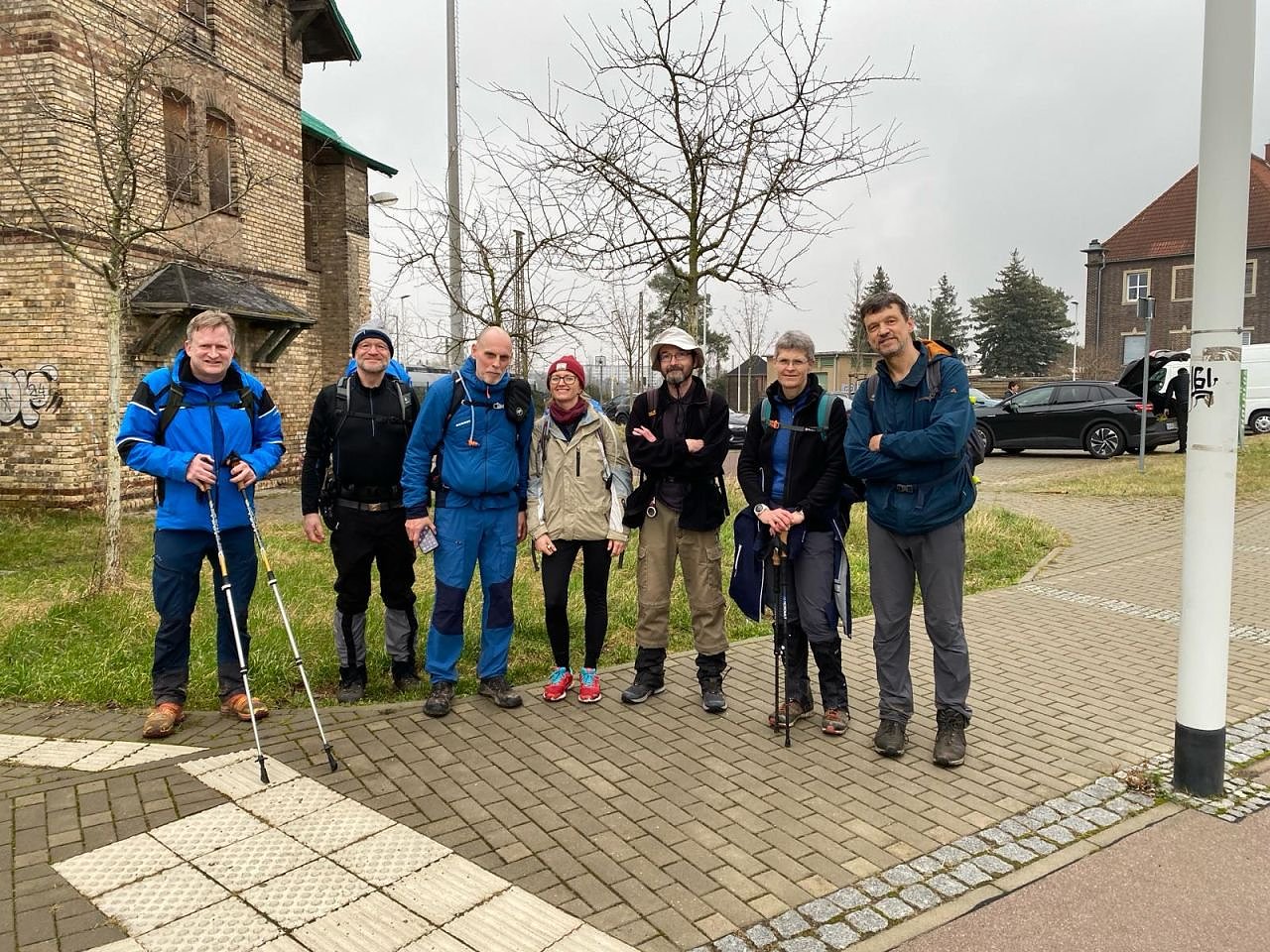 Bevor es wieder gen Heimat ging, entstand am S-Bahnhof Halle-Nietleben dieses Zielfoto. Drei Teilnehmende wanderten noch weiter zum Hauptbahnhof. Zwei von ihnen erhielten eine Urkunde über 105 Kilometer. (Foto: Bodo Schwarzberg)