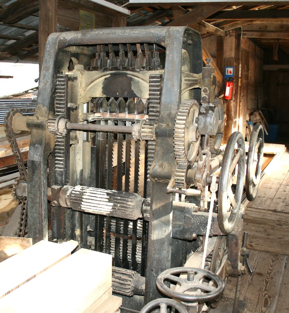 Ein 10 KW Elektromotor treibt es über einen 13 Meter langen Flachriemen an. Das Gatter hat einen Durchlass von 56 cm und kann Stämme mit einer Länge von acht Metern verarbeiten. Die Sägeblätter sind variabel verstellbar, so dass Latten, Bretter, Bohlen und Balken hergestellt werden können.