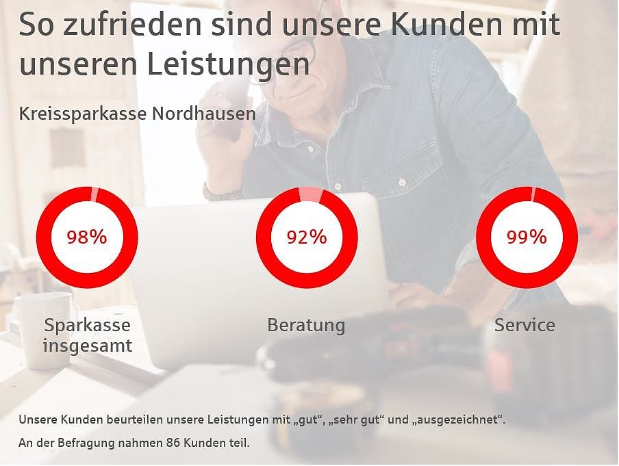 Besonders erfreulich war der externe Vergleich mit den weiteren teilnehmenden Sparkassen aus dem Verbandsgebiet Hessen-Thüringen. Bei der Thematik "Beratungsleistung" hat die Kreissparkasse Nordhausen bei sechs von elf Teilbereichen den 1. Platz erzielt. Ein Ergebnis, das stolz macht.