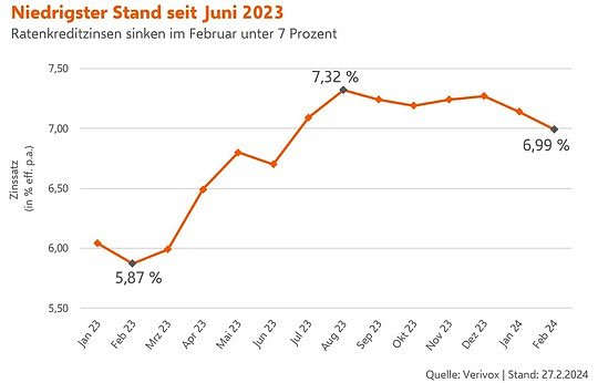 Die Zinswende erreicht den Ratenkreditmarkt. Im Februar sind die mittleren Zinsen der über Verivox abgeschlossenen Ratenkredite auf 6,99 Prozent gefallen. Das ist der niedrigste Stand seit Juni 2023. Im Vormonat Januar lagen die Zinsen noch bei 7,14 Prozent. Zum bisherigen Höchststand im August 2023 mussten Kreditnehmer im Mittel noch 7,32 Prozent Zinsen zahlen.