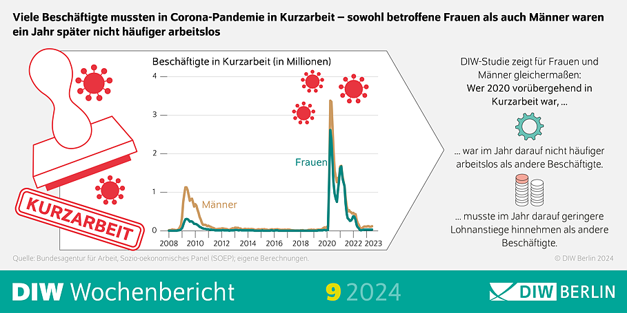 Kurzarbeit war auch in der Corona-Pandemie ein wirksames Instrument, um die Folgen des Wirtschaftseinbruchs auf dem Arbeitsmarkt einzudämmen, resümiert Clara Schäper aus der Forschungsgruppe Gender Economics im DIW Berlin, die für die Studie gemeinsam mit Forschungsgruppenleiterin Katharina Wrohlich Daten des Sozio-oekonomischen Panels (SOEP) ausgewertet hat. Frauen, die im Vergleich zur Finanzkrise deutlich häufiger in Kurzarbeit mussten, erlebten auch im Vergleich zu Männern keine größeren Einschnitte in ihre Erwerbsbiografie, so Wrohlich.