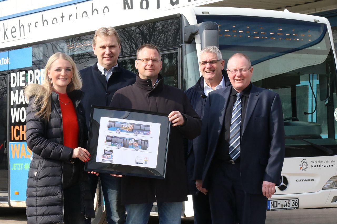 Der Bus wurde gestern bei den Stadtwerken übergeben, v.l.: Mariana Kohlause von VerkehrsMedien Thüringen, Marc Leineweber, Uli Schlegel und Thomas Wahlbusch von der IHK und Thorsten Schwarz (Foto: agl)