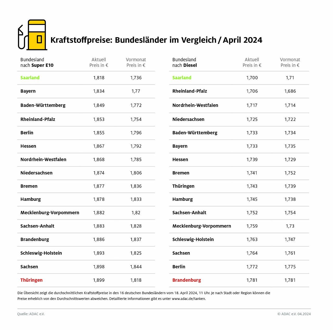 Für die heutige Untersuchung hat der ADAC die Preisdaten von mehr als 14.000 bei der Markttransparenzstelle für Kraftstoffe erfassten Tankstellen ausgewertet und den 16 Bundesländern zugeordnet. Die ermittelten Preise stellen eine Momentaufnahme vom 18. April, 11 Uhr, dar.