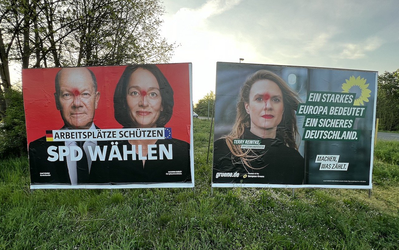 nur weil es Plakate von SPD und Grüne sind und der Farbtupfer zwischen den Augen sitzt, muss jetzt ermittelt werden ?