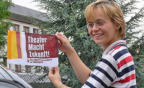 Ab sofort können Freunde des Theaters und Orchesters ihre Sympathie für die Nordthüringer Kultureinrichtung am Auto sichtbar machen. "Was bei der WM zur guten Stimmung beitrug, kann für die Kampagne zur Rettung von Theater und Orchester nichts schaden", so Ilka Diete, Pressesprecherin der Theater-/Orchester GmbH.