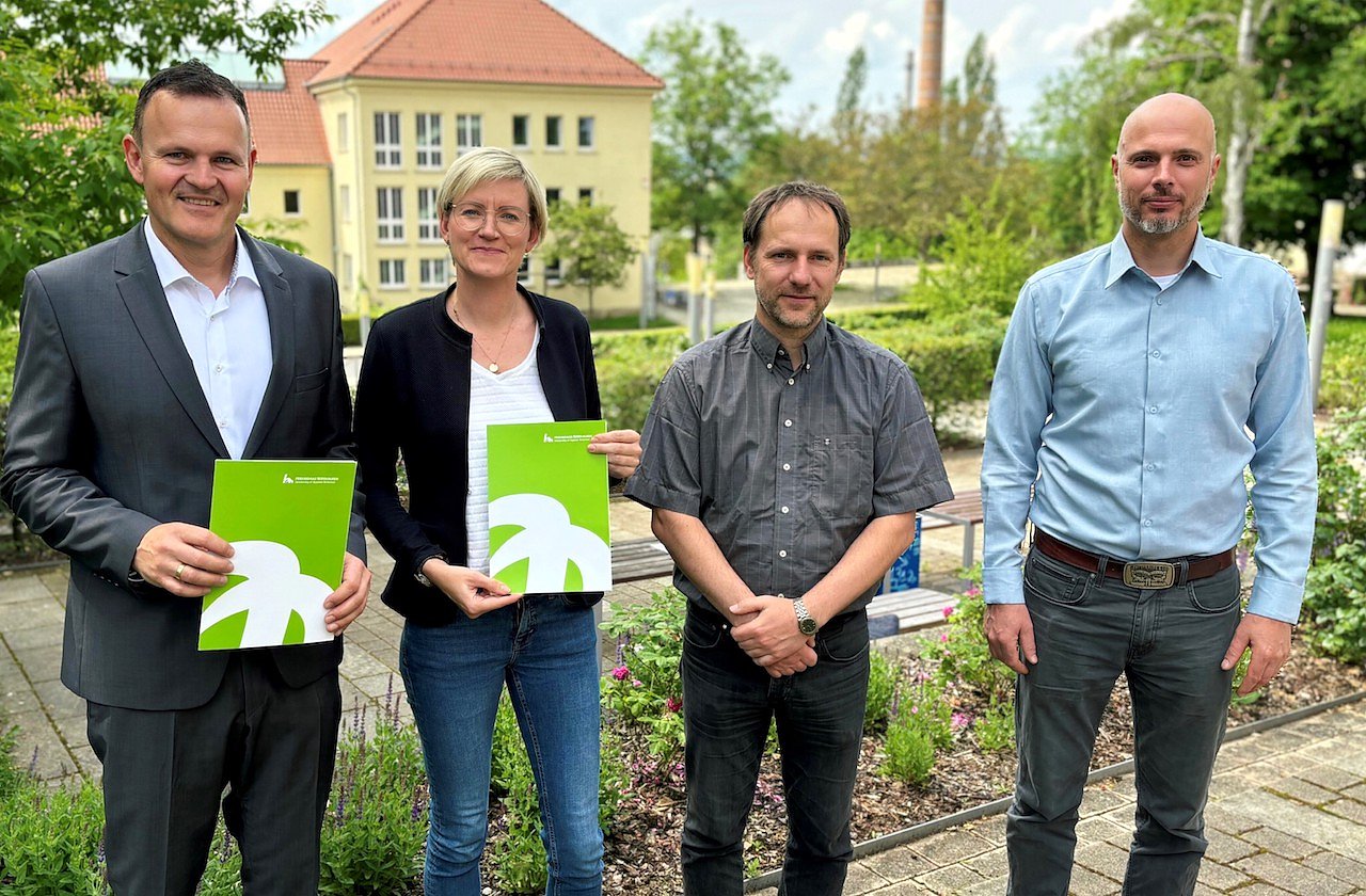 Prof. Dr. Jörg Wagner, Jessica Völlger, Prof. Dr. Mario Schölzel und Thomas Füldner (v.l.n.r.) freuen sich auf die künftige Zusammenarbeit (Foto: Tina Bergknapp)