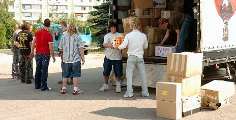 Ein 20 Tonnen LKW vom Berufsbildungszentrum für den Straßenverkehr parkte heute früh vor der Fahrschule Levin in der Spangenbergstraße. Viele helfende Hände packen seit neun Uhr mit an und beladen das Fahrzeug. Die jungen Männer kommen von der Zivildienstschule in Sondershausen und unterstützen wie viele andere den Hilfstransport nach Rumänien.