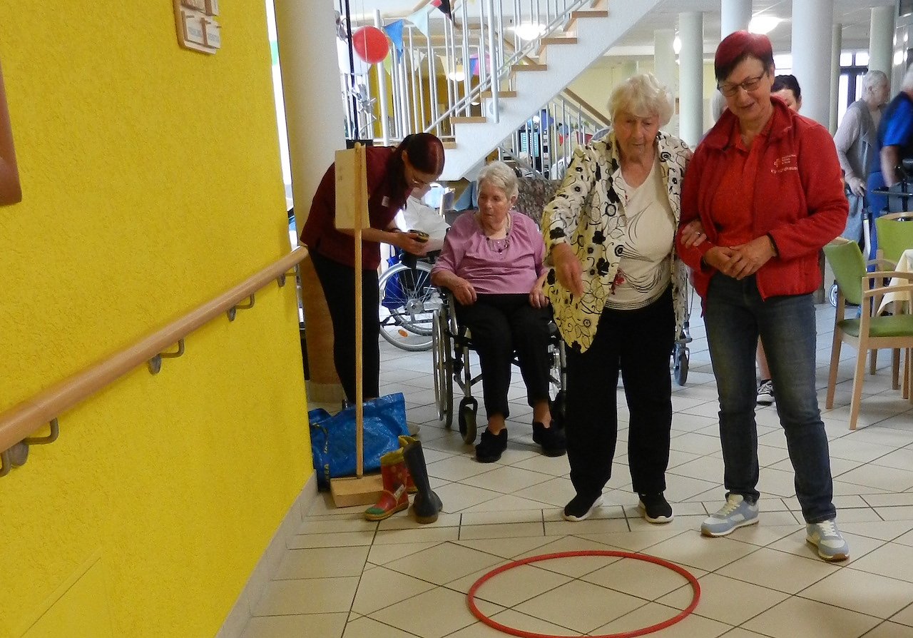 Die Bewohner des Pflegeheims und ihre Gäste absolvierten gemeinsam die verschiedenen sportlichen Stationen, die sowohl Geschicklichkeitsübungen als auch Ballspiele und koordinative Aufgaben umfassten. Diese Aktivitäten brachten nicht nur viel Spaß, sondern förderten auch den Gemeinschaftsgeist und die körperliche Fitness aller Beteiligten. Nach dem sportlichen Teil wurden alle Teilnehmer mit Bratwürstchen und Kartoffelsalat versorgt.