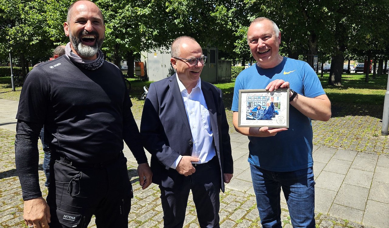Die Biker von Ride for Charity wollen Pfarrer Jochen Lenz überraschen und sich ganz persönlich von ihm verabschieden. Der Plan ist gelungen, die Freude groß. Thomas Claus und Dirk Schimm bringen eine Erinnerung vom letzten Biker-Gottesdienst mit, den sie hier mit Pfarrer Lenz gefeiert haben. Mit einer Harley rollte er dazu in die Kirche. Heute nicht.
