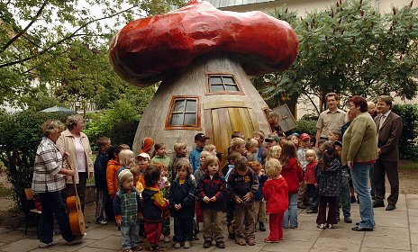 Elisabeth Stolze-Bley hatte das Haus 1997 für das Märchen Das Tierhäuschen entworfen und bauen lassen. In dem vom Chor produzierten Weihnachtsstück diente es Hahn, Frosch, Maus und Igel als Wohnung. Vom Hausmeister der Kindereinrichtung wurde es jetzt wasserfest angestrichen, so dass es den Kindern als Spielhaus im Freien gute Dienste leisten wird.