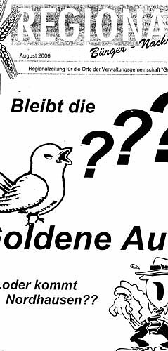 Im nichtöffentlichen Teil der heutigen Sitzung des Hauptausschusses wird den Stadträten der Entwurf zum Eingemeindungsvertrag mit den Gemeinden Urbach und Görsbach vorgestellt. Während die Eingemeindung von Rodishain und Stempeda weitestgehend geräuschlos über die kommunalpolitische Bühne gehen wird, ist das in der Goldenen Aue nicht der Fall. Morgen sollen in einer Einwohnerversammlung die Bürger von Görsbach ihre Meinung sagen. Vertreter der Stadtverwaltung Nordhausen werden ihrerseits die Argumente für eine Eingemeindung darlegen. Es wird da auch gesagt werden, dass nicht die Stadt Nordhausen auf Einkaufstour war, sondern dass die beiden Orte sich eine Option für Nordhausen offen ließen.So ist es auch in den Regionalen Bürgernachrichten der Goldenen Aue zu lesen. In einem Beitrag widmet sich das Kreistagsmitglied Maik Schröter (CDU) dem Abwanderungswillen von Görsbach und Urbach und macht auf die Offerten der Rolandstadt aufmerksam. Die Stadt Nordhausen hat natürlich an Görsbach und Urbach verlockende Angebote unterbreitet. Nur ist es rechtlich nicht haltbar und politisch nicht vertretbar, Ortsteile einer Stadt mit unterschiedlichen Steuersätzen zu belegen, schreibt Schröter.