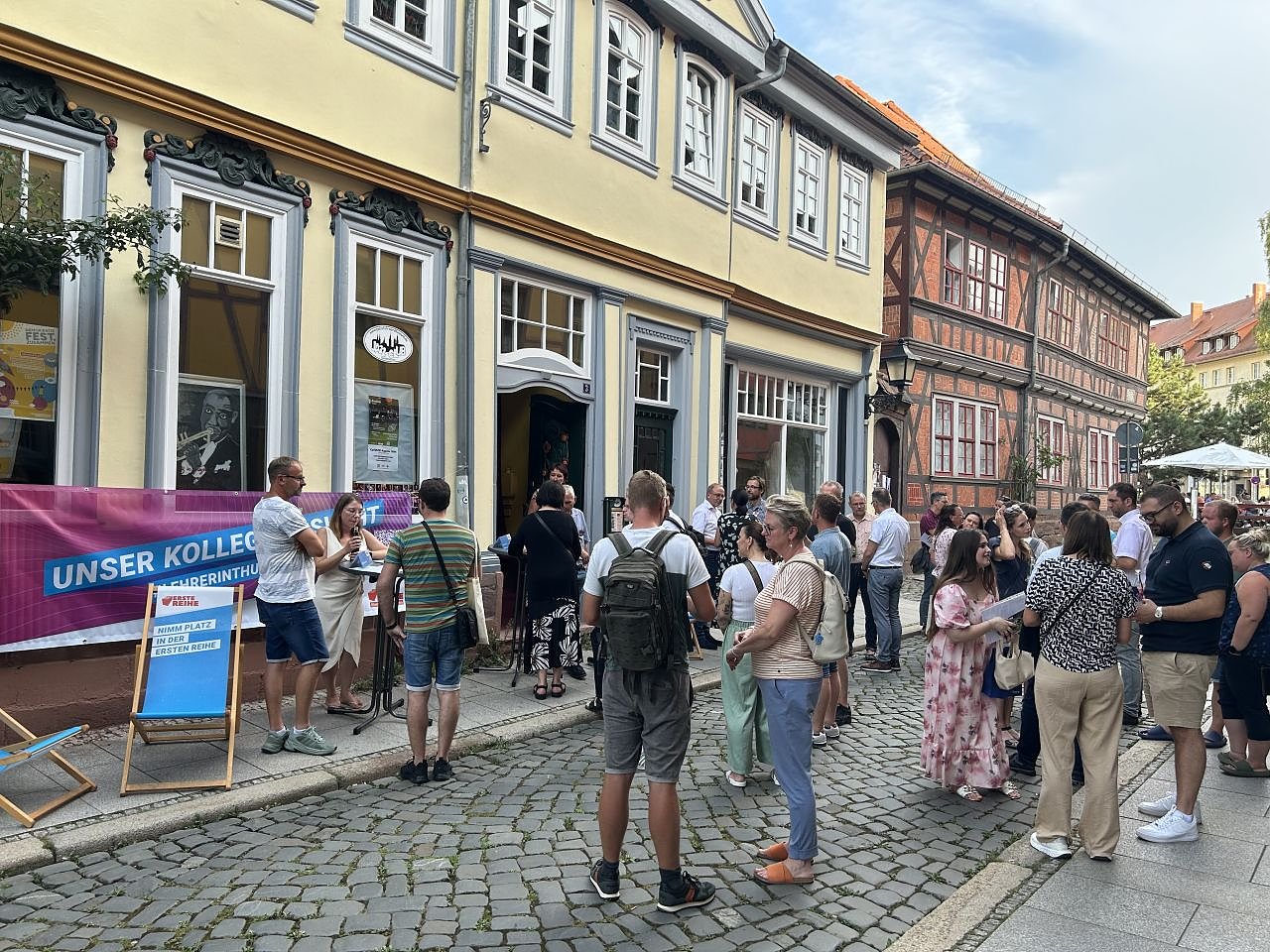 Rund 80 Zuhörerinnen und Zuhörer waren gekommen und nutzten die Beratungsmöglichkeiten, die das Schulamt mit einem großen Team vor Ort anbot. Aufgrund der Hitze wurden etliche der Gespräche am Ende sogar direkt auf die Barfüßerstraße verlegt. Wie gestaltet sich der Weg aus einem außerschulischen Job in den Schuldienst? Welche Abschlüsse braucht man bzw. wie kann man sich nachqualifizieren? Und geht auch etwas jenseits des Unterrichtens als Lehrerin oder Lehrer?