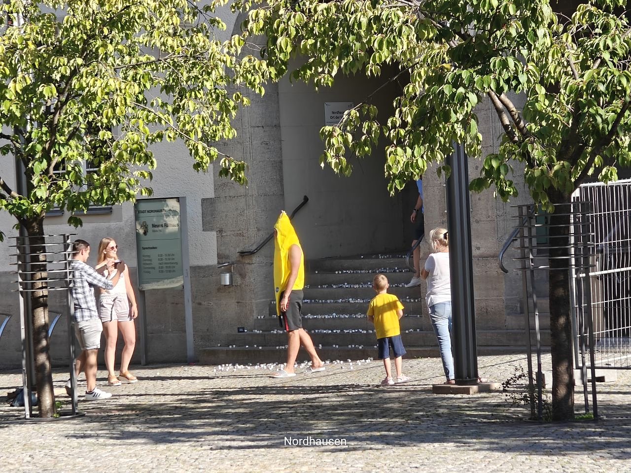 Der Hintergrund: wer mit 30 noch nicht verheiratet ist und kein Kind hat, muss die besagte Treppe fegen. Die Tradition kommt scheinbar aus Harzgerode. Ob das Bananenkostüm auch aus dem Brauchtum kommt, ist unklar.