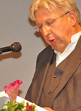 Für den Film hat uns noch ein Großteil des Geldes gefehlt - doch wir konnten nicht mehr warten, wir mussten ihn jetzt drehen, denn die Überlebenden - unsere Zeitzeugen - sterben sagte Film-Regisseur Eberhard Görner (Foto) im Theater. Der Film schildere Entstehung und Geschichte des Lagers und seiner Außenstelle auf zwei Ebenen: Aus Sicht der Opfer anhand von Interviews und Szene aus historischen Dokumentar- und Spielfilmszenen einerseits und andererseits anhand der Geschichte des Schauspielers Rolf Hoppe, der in der Südharzstadt Ellrich geboren wurde, aufwuchs und seine Jugend verbrachte. Ellrich war Standort eines großen und besonders brutalen Dora-Außenlagers. Hoppe schildert in Interview-Sequenzen sein persönliches Erleben des Lagers in seiner unmittelbaren Nachbarschaft. Der Film soll im kommenden Jahr im mdr gezeigt werden.