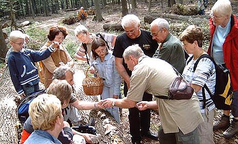Unter der Leitung des Pilzberaters Dr. Heinig begaben sich die Naturfreunde auf die Suche nach den begehrten Waldfrüchten und wurden im Kohnsteinmassiv fündig. Trotz der länger ausbleibenden Niederschläge konnten mehr als 40 Pilzarten gesammelt und bestimmt werden. Dr. Heinig wies auf die Bedeutung von Pilzen im Ökosystem Wald hin, erläuterte Bestimmungsmerkmale und gab wichtige Hinweise, so z.B. dass Täublinge am knackigen, nicht fasernden Stiel und spröden Lamellen erkennbar sind, Reizker mit rotem Milchsaft als genießbar gelten, der bisher als Speisepilz hochgeschätzte Grünling vermutlich als Auslöser von Muskelschwund fungiert und Perlpilze nur von erfahrenen Pilzfreunden gesammelt werden sollten. Deshalb auch sein Appell an alle Speisepilzsammler, sich im Zweifelsfall an eine Pilzberatungsstelle zu wenden.