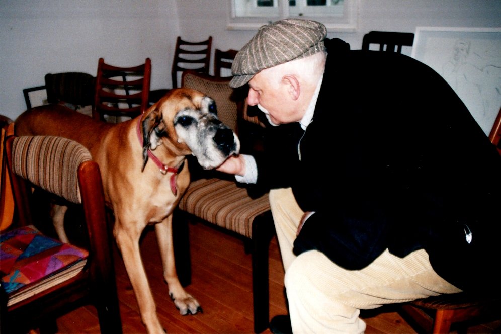 Doggen waren für diese Familie sehr wichtig, davon sprach der Künstler gern und schrieb auch darüber. Eines seiner Bilder von 2001 heißt Lieber Kerl, das sagt alles. Bei dem aktuelle Besuch der derzeitigen Mackensenschau im Kunsthaus Meyenburg sahen wir auch einige Hundebildnisse. Wir fragten deshalb bei Elke Rechtacek, der Frau des Künstlers Lothar Rechtacek, nach, von denen Mackensens Doggen stammten: Gerd Mackensen hatte einen gefleckten Doggenrüden von uns namens Wotans Meute, das war seine erste Dogge. Die gelbe Doggenhündin stammt aus Italien. Diese hatten wir importiert, weil wir sie für die Zucht haben wollten. Man brauchte nicht nach Italien reisen, eine Schauspielerin aus Süddeutschland brachte sie mit nach Deutschland, L. R. holte sie bei ihr ab. Wegen eines Zahnfehlers war sie nicht zur Zucht geeignet. Sie war ein sehr liebes und sensibles Tier und da Gerd zur Zeit doggenlos war, kam sie zu ihm.