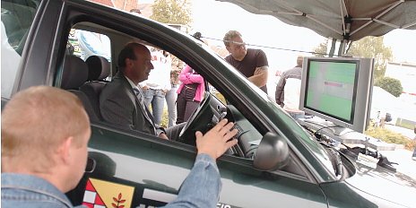 Ein Audi wurde zum Bremssimulator umgebaut. Keine Computerspielatmosphäre sondern echtes Autofahrgefühl wird so vermittelt. An diesem Simulator konnte auch Landrat Joachim Claus nicht vorbeigehen. Der Schirmherr der Aktion Junge Fahrer der Kreisverkehrswacht setzte sich selbst hinters Steuer. Als Landrat steht ihm ein Dienstwagen mit Chauffeur zu, besonders in Übung ist er also nicht. Als die rote Ampel aufleuchtet, trat er auf das Pedal, und das Auto auf dem Monitor steht, kein Unfall passiert. Neugierige Jugendliche bestaunen den reaktionsschnellen Politiker. Danach kamen sie selbst dran, denn besonders die Autofahrer zwischen 18 und 25 Jahren sollen mit teils drastischen Methoden über die Gefahren von hoher Geschwindigkeit, Alkohol und Drogen im Straßenverkehr aufgeklärt werden.
