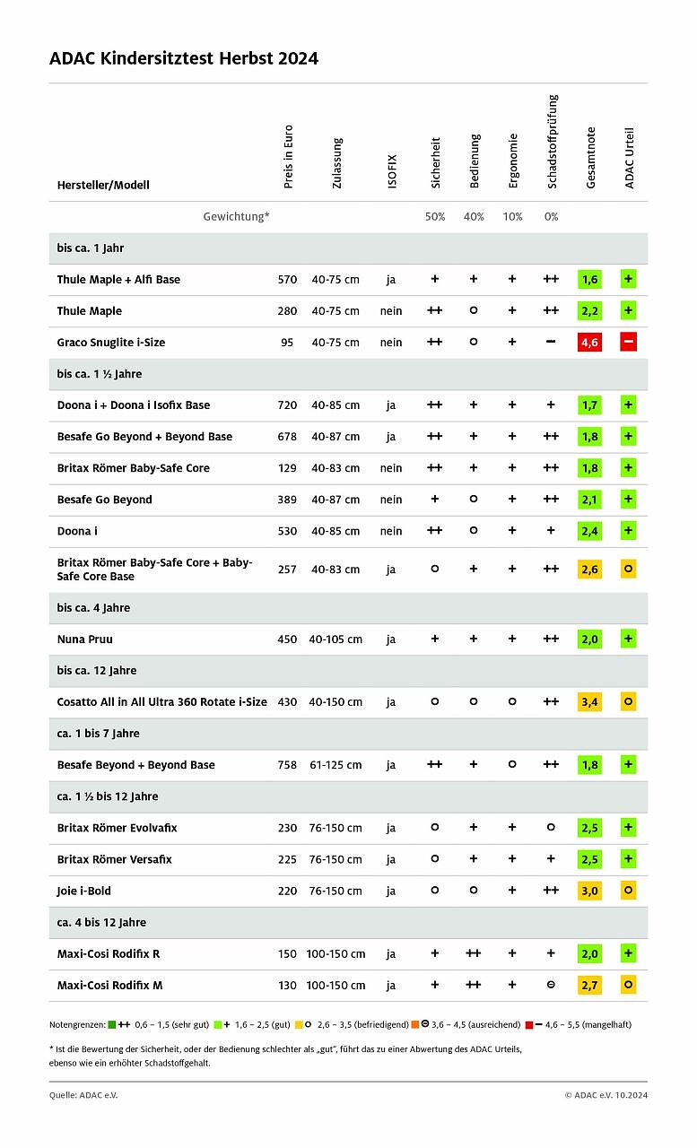 Spitzenreiter bei den Babyschalen ist der Thule Maple + Alfi Base mit der Note 1,6, dicht gefolgt vom Modell i von Doona mit der entsprechenden Basis Doona i Isofix Base (Note 1,7). Beide Modelle bestehen die Sicherheitsprüfungen überdurchschnittlich gut und sind leicht zu bedienen.
