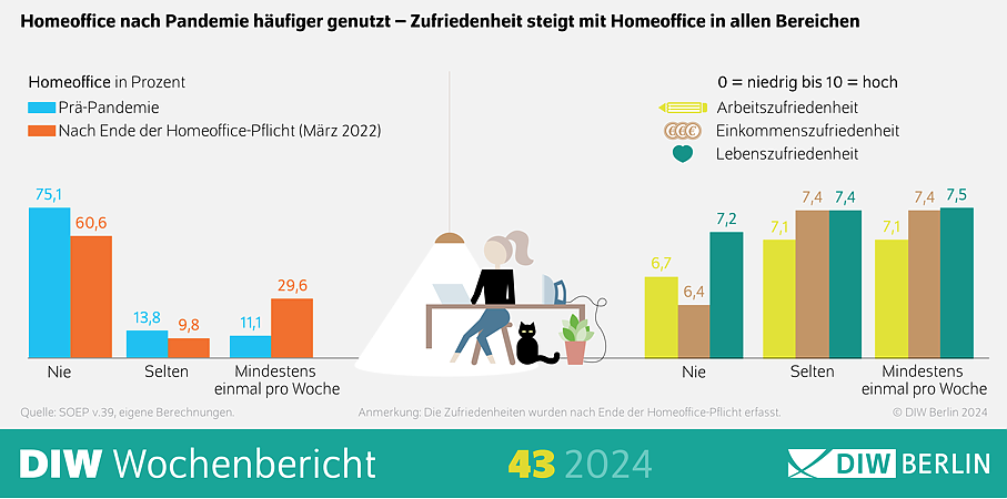 Vor allem höherqualifizierte und Vollzeitbeschäftigte arbeiten häufiger im Homeoffice. Geringfügig Beschäftigte sind kaum von diesem Wandel der Arbeitswelt betroffen. Die Verbreitung von Homeoffice varriert auch mit der Haushaltsstruktur: Beschäftigte mit Kindern nutzen das Homeoffice besonders häufig, vor allem während der Pandemie war das der Fall. Beschäftigte mit Homeoffice sind insgesamt zufriedener, sowohl mit ihrer Arbeit und dem Einkommen als auch mit ihrem Leben insgesamt – obwohl die Möglichkeit der Heimarbeit tendenziell mit einer längeren Arbeitszeit verbunden ist.