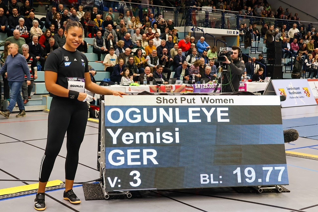Am Samstag puschten 1620 Zuschauer die Olympiasiegerin und deutsche Leichtathletin des Jahres 2024, Yemisi Ogunleye (MTG Mannheim) zu einer neuen Weltjahresbestleistung und Verbesserung ihres eigenen Hallenrekordes von 19,57 m auf 19,77m. Damit setzt Nordhausen Maßstäbe in der Weltleichtathletik. In den nächsten Wochen folgen Starts der Ausnahmeathletin in Düsseldorf, Berlin und Dortmund, anschließend die Hallen - EM und WM.